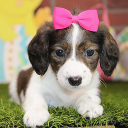 Hi, I'm Inga! I'm a 6-week-old female Dachshund with a beautiful brindle coat, born on January 26. I'll be ready to go home to my forever family after March 24, once I'm grown enough to leave my litter. I'm APR registered. I love to run and roll around outside. But, my favorite thing to do after a long day at play is to snuggle up on the couch next to my family and sleep as they pet my head.