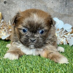 Hi, I'm Tia! I'm a 6-week-old female Shih Tzu with a beautiful brindle coat, born on January 23. I'll be ready to go home to my forever family after March 27, once I'm grown enough to leave my litter. When I reach my adult size, I should weigh between 8–12 lbs. I'm AKC registered. I'm ready to make every day a little brighter with my puppy love.