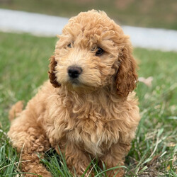 Hi, I'm Darby! I'm a 13-week-old male Goldendoodle. My dad is a Poodle and my mom is a Goldendoodle. I have a beautiful apricot coat, and I was born on December 22. I am ready now to plan my trip to my forever family. I'm ICA registered. I love to run and roll around outside. But, my favorite thing to do after a long day at play is to snuggle up on the couch next to my family and sleep as they pet my head.