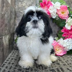 Hi, I'm Archer! I'm an 18-week-old male Shih Tzu with a beautiful black & white coat, born on November 14. I am ready now to plan my trip to my forever family. Once I reach my adult size, I'm expected to weigh between 10–16 lbs. I'm AKC registered. I can't wait to be your best friend and cuddle buddy for life.