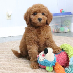 Hi, I'm Marshall! I'm a 10-week-old male Goldendoodle. My dad is a Poodle and my mom is a Goldendoodle. I have a beautiful red coat, and I was born on January 28. I'll be ready to go home to my forever family after March 25, once I'm grown enough to leave my litter. I'm a little ball of fluff with a big personality.